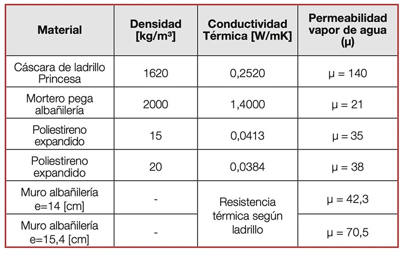 PROPIEDADES: A continuación las propiedades de materiales para la modelación del comportamiento higrotérmico de la albañilería de acuerdo al requerimiento de la reglamentación térmica vigente: